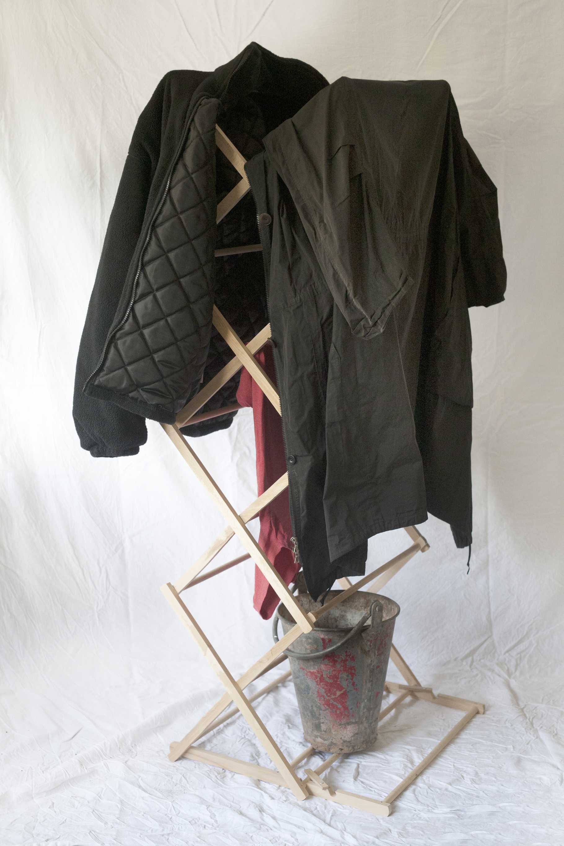 The object below is a clothes dryer with jackets, t-shirt and bucket.